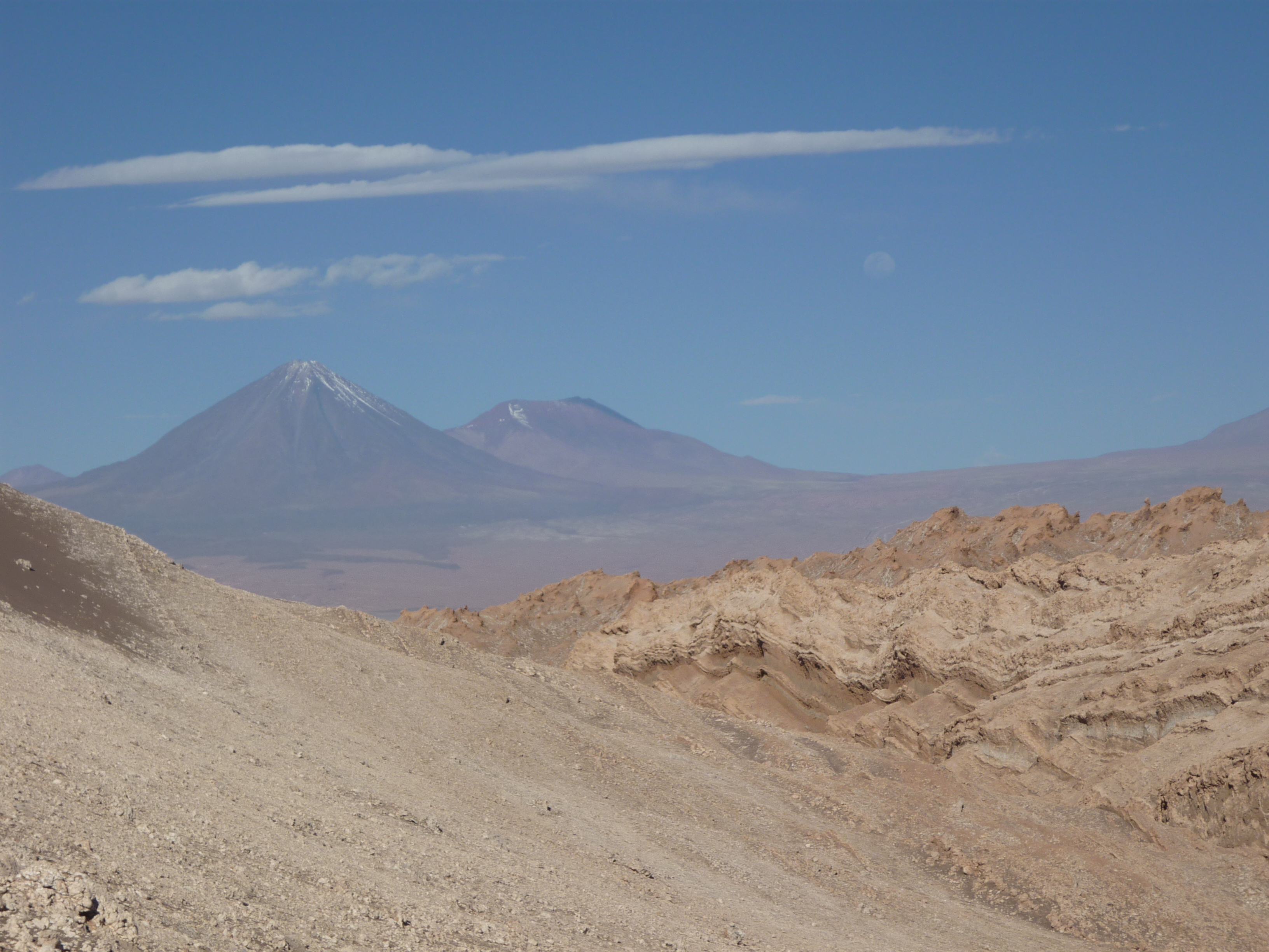 Having checked in we walked into town for lunch at a restaurant which has been recommended called Las Delicias de Carmen. After lunch we are picked up for the first of the four tours we have booked. This one is to a place just outside town called the Valle de la Luna. The landscape here is volcanic, created by the deposits from the volcanoes that ring the area. Not the highest, but the most noticeable because it stands alone and has the classic cone shape of a volcano, is Licancabur (*), whose summit is at 5,920 metres. The tour lasts four hours and is quite strenuous on a hot and dry afternoon. It ends with a view of the sunset from just outside the town, which is spectacular (*). Supper is a pizza take-away from Pizzeria El Charrua just off the main street Caracoles.