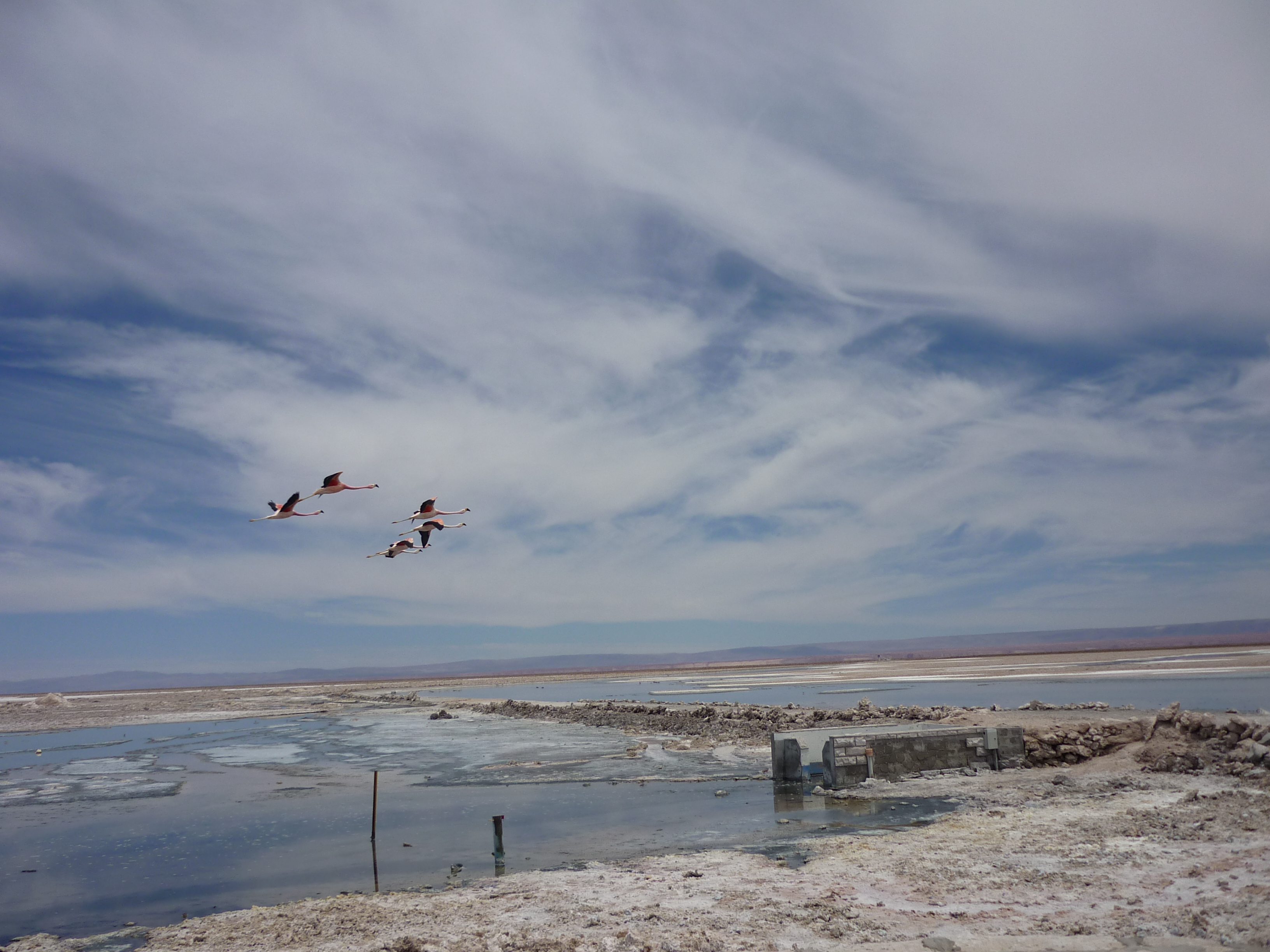 Back on the valley floor, we turn off the main road and head towards Laguna de Chaxa, which is out in the middle of the Salar de Atacama, the Atacama salt flats. The salt creates an unforgiving landscape but there are numerous birds and lizards. Most spectacular are the Andean flamingos. We are fortunate to catch a flight of five birds coming into land on the water (*).