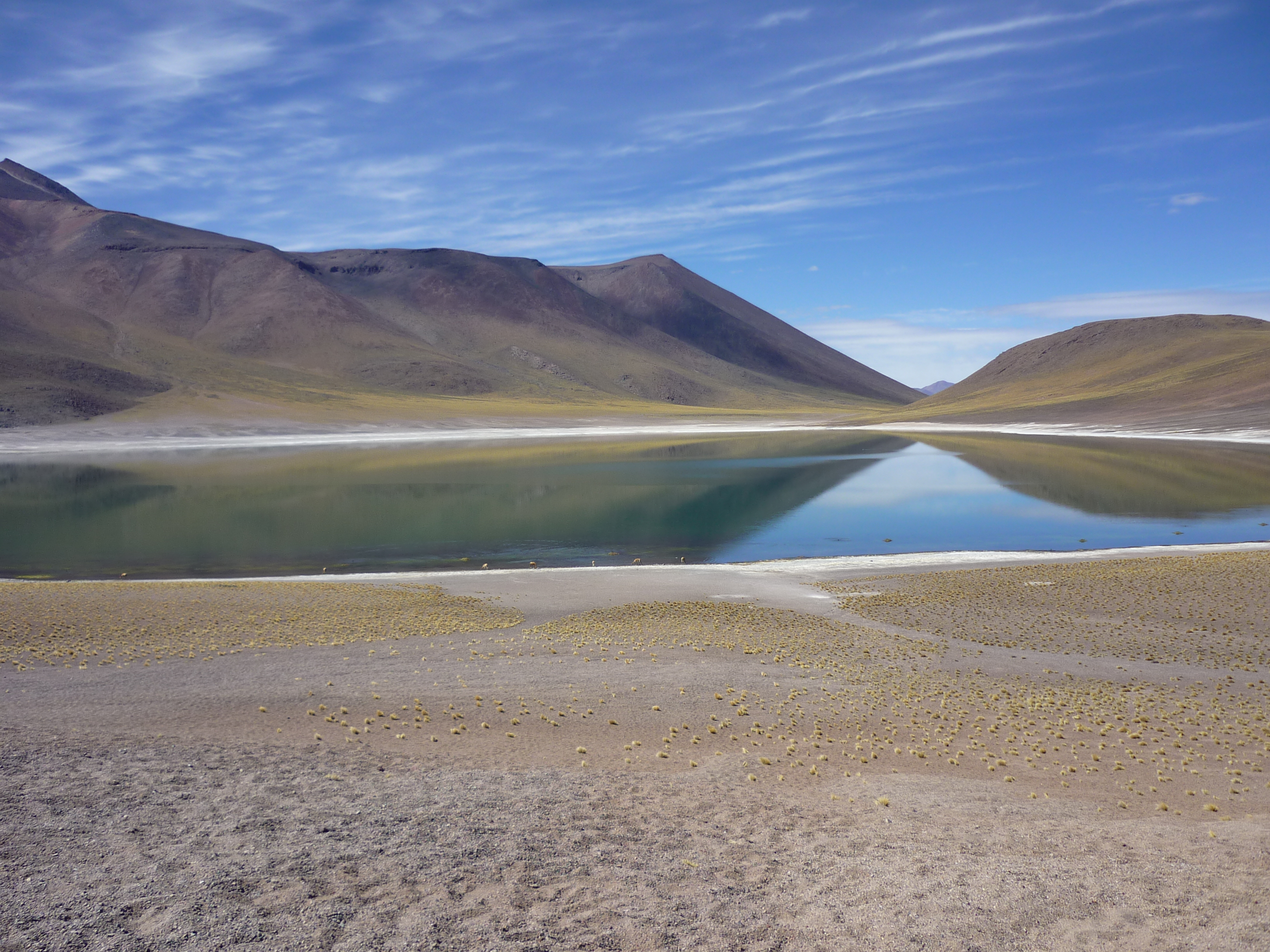 The next day we have two tours. The first is a journey up into the hills. On the way we cross the Tropic of Capricorn and stop for breakfast by the line marker. Across the salt flats we can see the spoil thrown up from the lithium mines. Our destination, two lakes called Laguna Miscanti and Laguna Miñiques (*), are at an elevation of 4,300 metres. Although it is not difficult to walk, you can feel the thinness of the air. It is a beautifully still morning and the mountains are mirrored perfectly in the water. Some vicuñas are grazing by the water’s edge and there are a couple of Andean flamingos on the farther side. On the way down we stop briefly at the village of Socaire. This is not a dry place as we are actually on the edge of the Atacama, and water from the rivers is dammed to provide irrigation for the terraced fields. Our guide Edmundo explains that control of the water flow is vested in one of the farmers each year. The post is renewable, presumable if the task has been well carried out.
